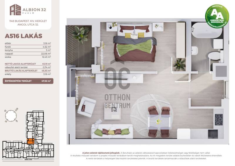 Eladó a XIV. kerületben, az Angol utcában még épülő ALBION32 projektben egy 5. emeleti, 45 nm-es 2 szobás + 3,2 nm erkélyes DK-i tájolású újépítésű okosotthon!- A társasházban 161 lakás lesz kialakítva, tárolókkal és teremgarázsban lévő gépkocsibeállókkal együtt.- A ház nagyvárosi, ám mégis sok zöldfelülettel rendelkező, családbarát környezettel várja leendő lakóit.- 5. emeleti 45 nm-es 2 szobás lakás belső zöldre néző ablakai és erkélye a nyugalom szigetét kínálja.- Beépítésre tervezett anyagok mind a mai legkorszerűbb minőséget képviselik.- Hőszivattyús mennyezeti hűtési-fűtési rendszer kerül kiépítésre.- Energetikai besorolása a megújulóenergia felhasználásának köszönhetően AA kategóriájú lesz.- Intelligens otthon rendszer lesz telepítve minden lakásba, melynek segítségével, a háztartás mindennapokban használt, elektronikus berendezései ellenőrizhetővé és vezérelhetővé válnak számunkra. - Modern ház és nyugodt parkos környezet remek választás saját célra és befektetésre is.- Kiváló fiatal életkezdőknek, pároknak, de a szépkorú korosztály számára is remek választás akadálymentes kialakítása miatt.- Közelben szinte minden gyalogszerrel elérhető, boltok, szolgáltatások, vendéglátóhelyek, gyermekintézmények, stb.- Közlekedési lehetőségek tárháza áll rendelkezésre 5 perces sétatávolságon belül.Ha további kérdés van az ingatlannal vagy a műszaki tartalommal kapcsolatban, keress bizalommal!