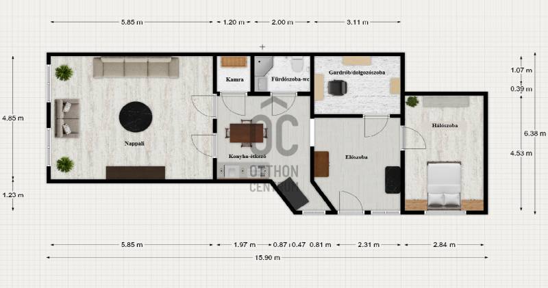 Sopron belvárosának közvetlen szomszédságában, a Bécsi úton kínálok megvételre egy 74 m² alapterületű, 1. emeleti lakást. A lakás nagy méretű, déli tájolású nappali, külön hálószoba, gardróbszoba, konyha–étkező, kamra, valamint fürdőszoba–wc kialakítású. A nappali kedvező méretének köszönhetően igény esetén két külön szobává is leválasztható, így a lakás akár három szobássá alakítható, ami hosszú távon is értékálló megoldást jelent.A nappali komfortját tovább növeli a beépített split klímaberendezés, amely a nyári hónapokban is kellemes hőmérsékletet biztosít. Az ingatlan műanyag nyílászárókkal felszerelt, az ablakok redőnnyel ellátottak, a fűtésről és a melegvíz-ellátásról Vaillant kombi gázkazán gondoskodik. A lakáshoz két különálló tároló is tartozik, amelyek jelentős és ritkán elérhető tárolási lehetőséget nyújtanak.A 9 lakásos társasház csendes, a lakóközösség rendezett. A közös költség mindössze 14.500 Ft/hó, amely kedvező fenntartási költséget jelent.Elhelyezkedése kiváló: a belváros, bevásárlási lehetőségek, iskola, óvoda, egészségügyi intézmények és a tömegközlekedés gyorsan és kényelmesen elérhetők, ugyanakkor az ingatlan nyugodt, élhető környezetet biztosít.Ez a lakás ideális választás saját célra, pároknak, családoknak, illetve befektetésként is remek lehetőség a kiváló lokáció és könnyű kiadhatóság miatt.További információért és megtekintési időpont egyeztetéséhez keressen bizalommal!Hitelre van szüksége?Az Otthon Centrum az ország egyik legnagyobb és legmegbízhatóbb hitelközvetítőjeként, teljes körű és díjmentes hitelügyintézéssel, biztosításkötéssel áll rendelkezésére!Kérje személyre szabott ajánlatunkat Kollégáinktól!