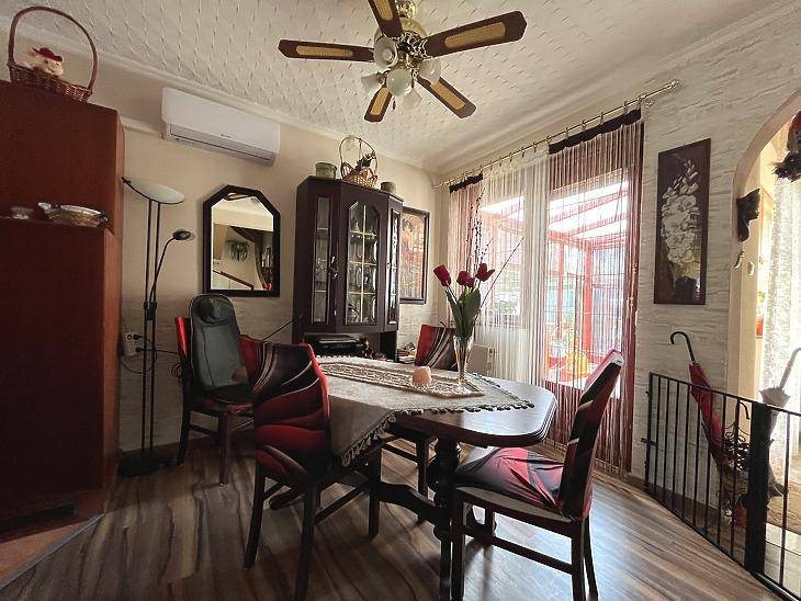 Óhegyen, csendes, családi házas övezetben kínálok megvételre egy 240 nm-es telken elhelyezkedő, 110 nm hasznos alapterületű, felújított családi házat. Az ingatlan 2+2 félszobás kialakítású, két fürdőszobával és mosdóval rendelkezik, így nagyobb család számára is kényelmes életteret biztosít.A ház fűtéséről gázkazán gondoskodik, de alternatív megoldásként kandalló és klíma is rendelkezésre áll. Összesen négy klíma került telepítésre, így minden helyiség hatékonyan hűthető és fűthető. Az energetikai korszerűsítés részeként 2020-ban napelemek kerültek a tetőre, ennek köszönhetően a rezsiköltség rendkívül kedvező, körülbelül 20.000 forint havonta. Legutóbbi energetikai minősítésen B besorolást kapott a rendkívül jól kialakított szigetelés miatt.Az ingatlan saját garázzsal rendelkezik, emellett az utcán a parkolás ingyenes. A házhoz elő- és hátsó kert is tartozik, valamint egy beépített, fűthető télikert, amely egész évben kellemes, világos plusz életteret biztosít. A kert gondozott, szép állapotú, ideális pihenésre és családi programokra.A délnyugati tájolásnak köszönhetően az ingatlan rendkívül világos.Elhelyezkedése kiváló, több buszjárat is könnyen elérhető, amelyek gyors kapcsolatot biztosítanak Kőbánya városközpont, Kőbánya-Kispest és a Puskás Ferenc Stadion irányába. Az Óhegy Park mindössze öt perc sétára található.Az ingatlan ideális választás családoknak és első lakásvásárlóknak, akik nyugodt környezetben, mégis kiváló közlekedés mellett keresik új otthonukat.